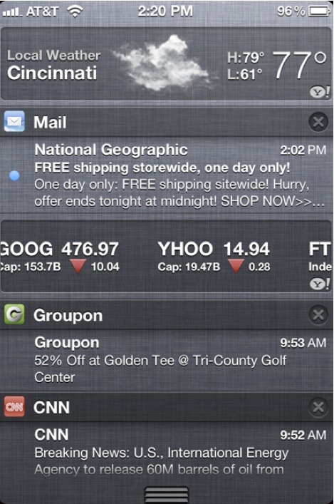 David: In all honesty, iOS does a better job than Android here. The concept is similar to Android, creating a notification pulldown from the status bar where you can see what’s occurred, and deal with it on YOUR terms. You drag down from the bar, and it’s all there.