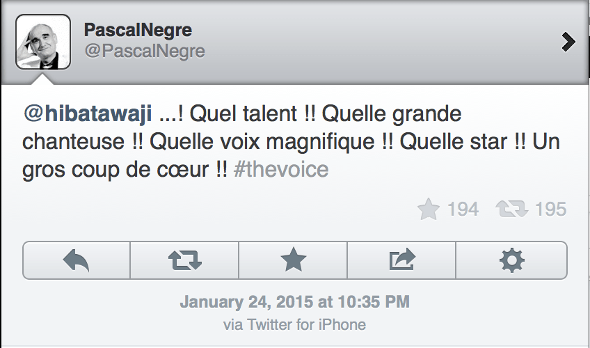 Hiba Tawaji The Voice France Published in How Hiba Tawaji Completely Owned France’s The Voice ← Previous Share this:Tweet Click to share on WhatsApp (Opens in new window) WhatsApp Click to share on Telegram (Opens in new window) Telegram Click to share on Reddit (Opens in new window) Reddit Pocket Click to email a link to a friend (Opens in new window) Email Click to print (Opens in new window) Print Share on TumblrLike Loading...