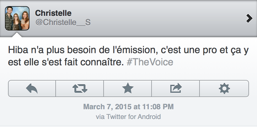 Hiba Tawaji The Voice – 11 Published in Hiba Tawaji Wins Her Battle on France’s The Voice ← Previous Next → Share this:Tweet Click to share on WhatsApp (Opens in new window) WhatsApp Click to share on Telegram (Opens in new window) Telegram Click to share on Reddit (Opens in new window) Reddit Pocket Click to email a link to a friend (Opens in new window) Email Click to print (Opens in new window) Print Share on TumblrLike Loading...