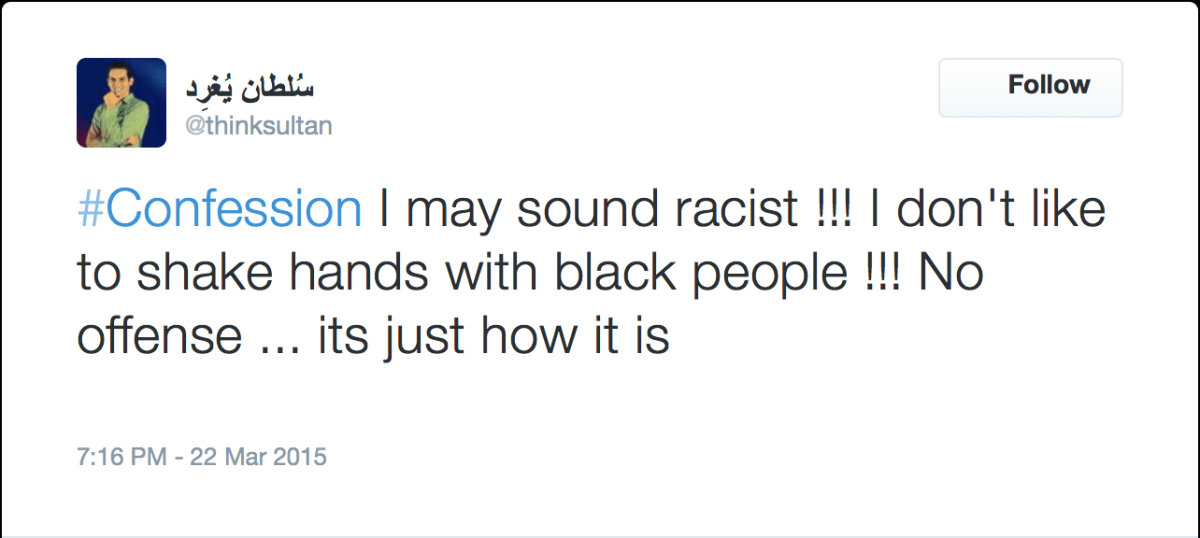 ThinkSultan racist tweet – 1 Published in On Lebanese Racists: The Guy Who Wouldn’t Shake Hands With A Black Person Because He’s Afraid To Get The Color ← Previous Next → Share this:Tweet Click to share on WhatsApp (Opens in new window) WhatsApp Click to share on Telegram (Opens in new window) Telegram Click to share on Reddit (Opens in new window) Reddit Pocket Click to email a link to a friend (Opens in new window) Email Click to print (Opens in new window) Print Share on TumblrLike Loading...