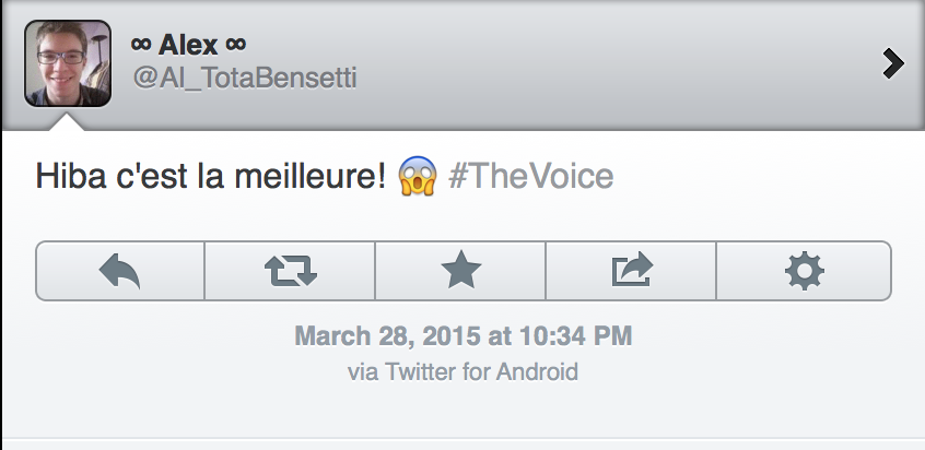 Hiba Tawaji The Voice – 14 Published in Hiba Tawaji Wins & Advances To The Final Stages Of France’s The Voice ← Previous Next → Share this:Tweet Click to share on WhatsApp (Opens in new window) WhatsApp Click to share on Telegram (Opens in new window) Telegram Click to share on Reddit (Opens in new window) Reddit Pocket Click to email a link to a friend (Opens in new window) Email Click to print (Opens in new window) Print Share on TumblrLike Loading...