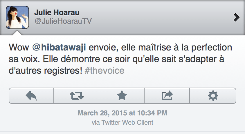 Hiba Tawaji The Voice – 15 Published in Hiba Tawaji Wins & Advances To The Final Stages Of France’s The Voice ← Previous Next → Share this:Tweet Click to share on WhatsApp (Opens in new window) WhatsApp Click to share on Telegram (Opens in new window) Telegram Click to share on Reddit (Opens in new window) Reddit Pocket Click to email a link to a friend (Opens in new window) Email Click to print (Opens in new window) Print Share on TumblrLike Loading...