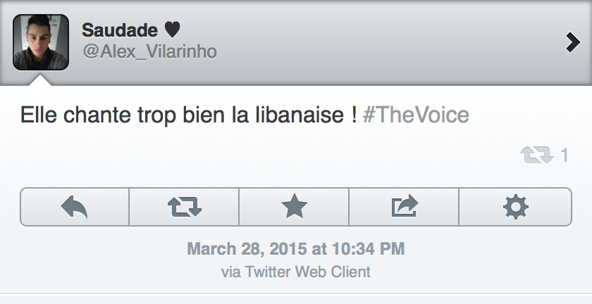 Hiba Tawaji The Voice – 9 Published in Hiba Tawaji Wins & Advances To The Final Stages Of France’s The Voice ← Previous Next → Share this:Tweet Click to share on WhatsApp (Opens in new window) WhatsApp Click to share on Telegram (Opens in new window) Telegram Click to share on Reddit (Opens in new window) Reddit Pocket Click to email a link to a friend (Opens in new window) Email Click to print (Opens in new window) Print Share on TumblrLike Loading...
