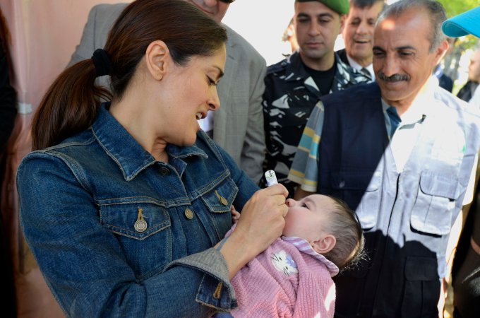 In this Saturday, April 25, 2015, photo provided by UNICEF, Mexican and American actress Salma Hayek gives a baby the polio vaccination during her visit at Saadnayz UNICEF protection center in the Bekaa Valley, Lebanon. Hayek is in Lebanon for “The Prophet,” an animated feature film she co-produced, which was written and directed by Roger Allers, the maker of the Disney production The Lion King. The film tells the story of a young girl who finds the voice she lost through her friendship with a poet imprisoned for his ideas. (Sebastian Rich/ UNICEF via AP)
