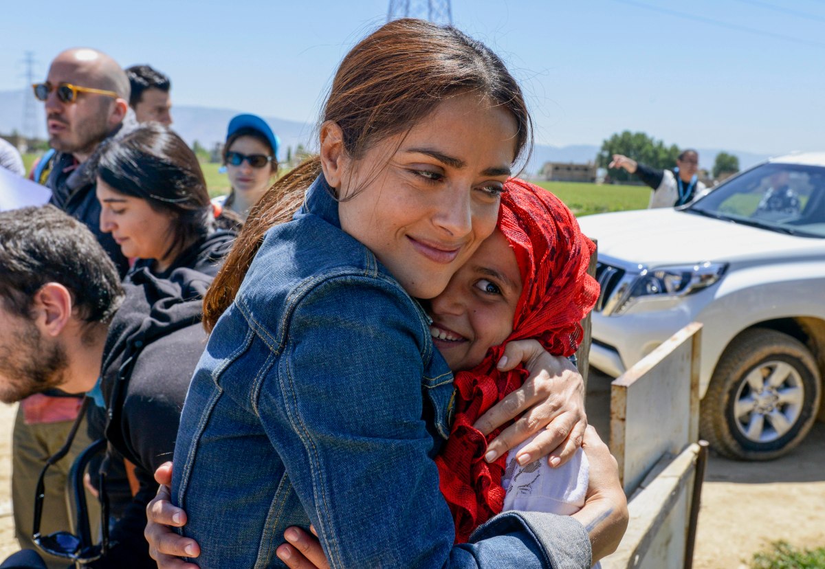 In this Saturday, April 25, 2015, picture provided by UNICEF, Mexican and American actress Salma Hayek hugs a Syrian refugee girl during her visit at Saadnayz UNICEF protection center in the Bekaa Valley, Lebanon. Hayek is in Lebanon for “The Prophet,” an animated feature film she co-produced, which was written and directed by Roger Allers, the maker of the Disney production The Lion King. The film tells the story of a young girl who finds the voice she lost through her friendship with a poet imprisoned for his ideas. (Sebastian Rich/ UNICEF via AP)