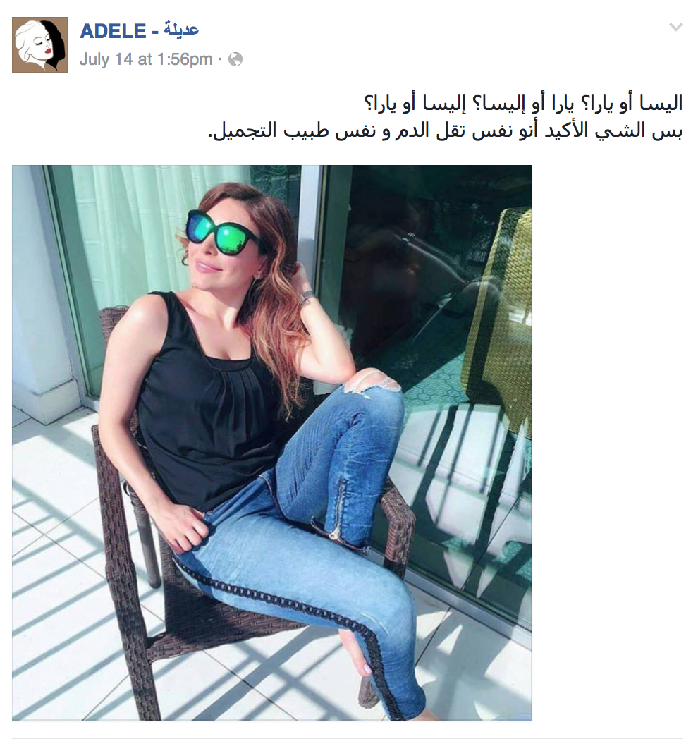 Screen Shot 2016-07-25 at 2.49.04 PM Published in Adeela & Why The Fans Of Nancy Ajram, Elissa, Other Divas Need To Be Less Butthurt With Jokes ← Previous Next → Share this:Tweet Click to share on WhatsApp (Opens in new window) WhatsApp Click to share on Telegram (Opens in new window) Telegram Click to share on Reddit (Opens in new window) Reddit Pocket Click to email a link to a friend (Opens in new window) Email Click to print (Opens in new window) Print Share on TumblrLike Loading...