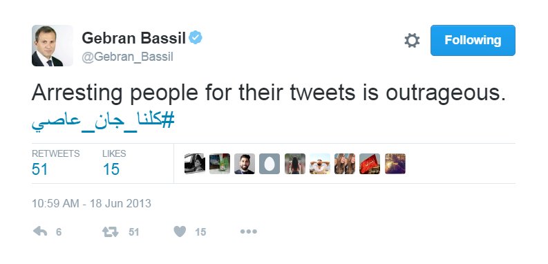 gerban-bassil-tweet Published in Dear Lebanon, Your Dignity Has More To Worry About Than a Facebook Status ← Previous Share this:Tweet Click to share on WhatsApp (Opens in new window) WhatsApp Click to share on Telegram (Opens in new window) Telegram Click to share on Reddit (Opens in new window) Reddit Pocket Click to email a link to a friend (Opens in new window) Email Click to print (Opens in new window) Print Share on TumblrLike Loading...