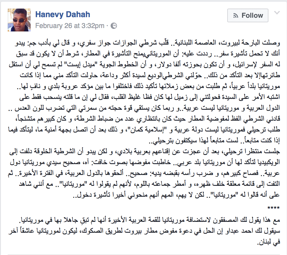 Mauritania Beirut airport deportation Published in Wikipedia Saves Mauritanian From Deportation At Beirut Airport: Border Officer Didn’t Know His Country Was Arab Share this:Tweet Share on WhatsApp (Opens in new window) WhatsApp Share on Telegram (Opens in new window) Telegram Share on Reddit (Opens in new window) Reddit Pocket Email a link to a friend (Opens in new window) Email Print (Opens in new window) Print Share on TumblrLike Loading...