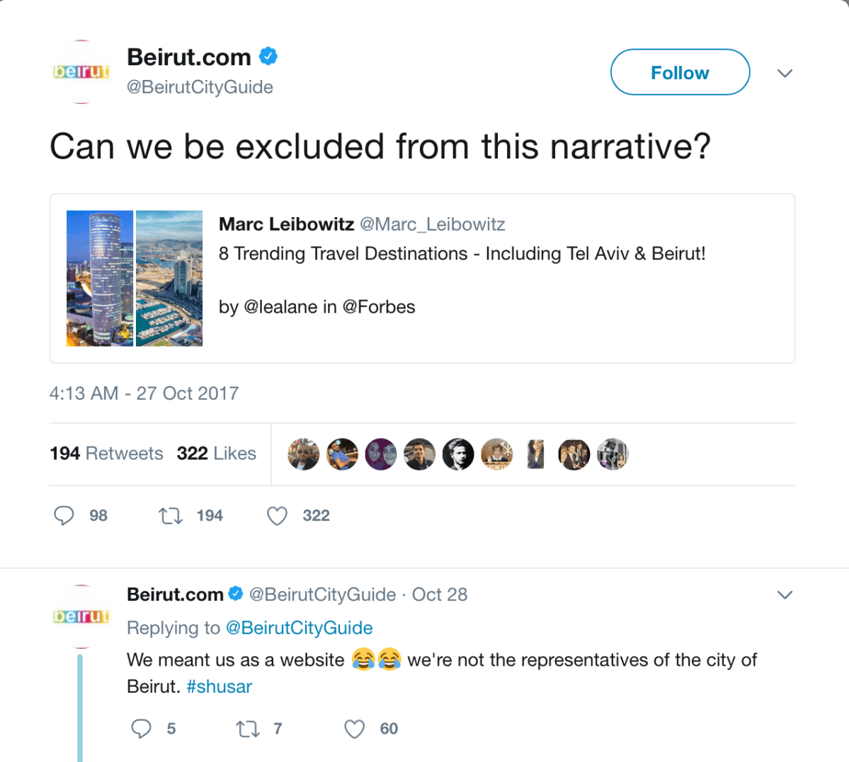 Screen Shot 2017-10-30 at 8.56.01 AM Published in How A Tweet Launched A Mini Regional Crisis: Mossad Launches #TelAvivLovesBeirut, and Beirut Responds Next → Share this:Tweet Click to share on WhatsApp (Opens in new window) WhatsApp Click to share on Telegram (Opens in new window) Telegram Click to share on Reddit (Opens in new window) Reddit Pocket Click to email a link to a friend (Opens in new window) Email Click to print (Opens in new window) Print Share on TumblrLike Loading...