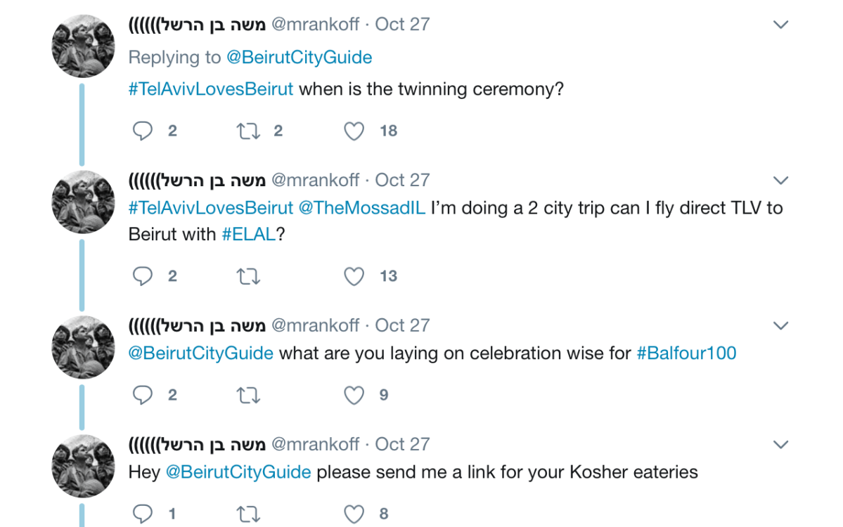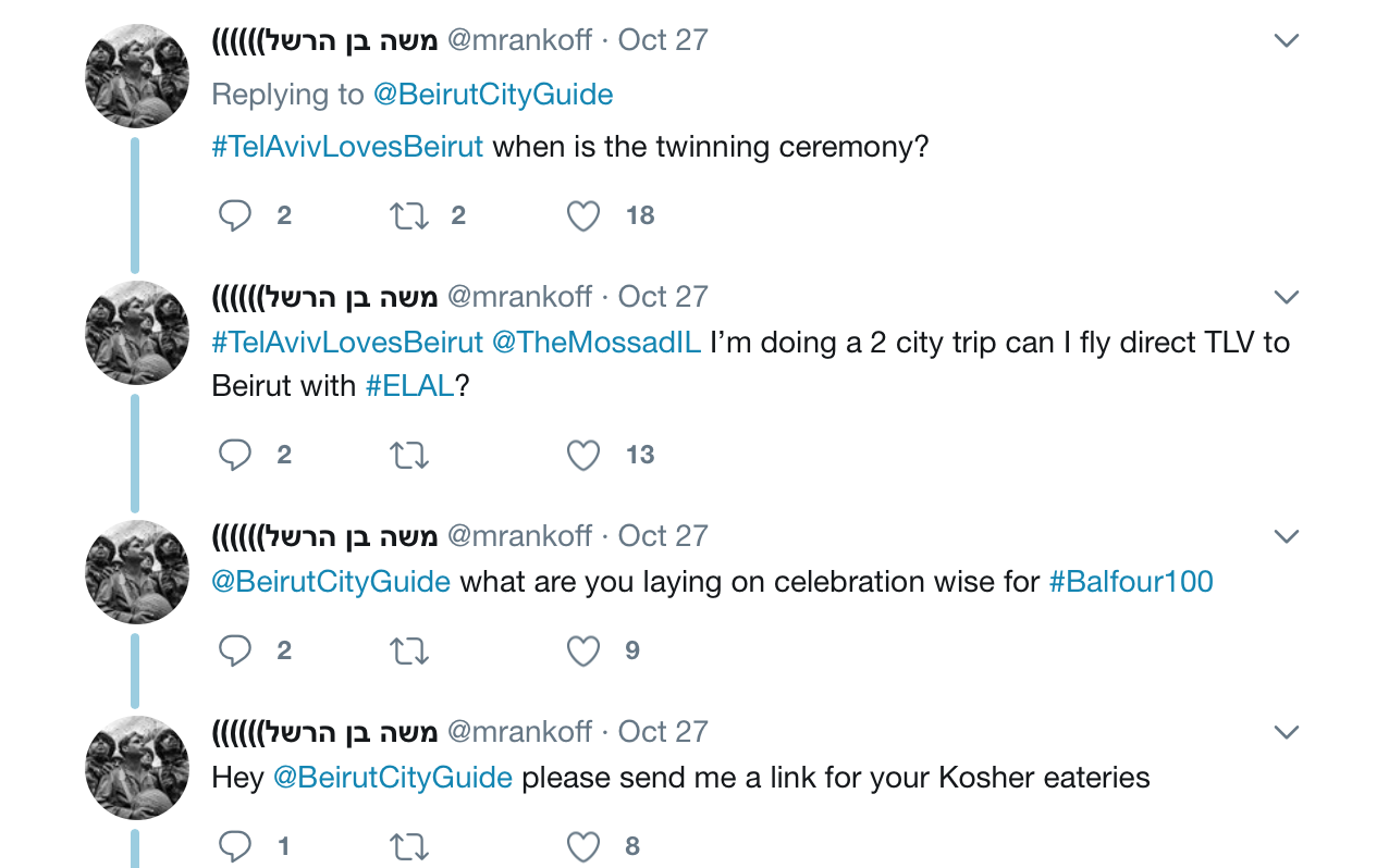 Screen Shot 2017-10-30 at 9.01.00 AM Published in How A Tweet Launched A Mini Regional Crisis: Mossad Launches #TelAvivLovesBeirut, and Beirut Responds ← Previous Next → Share this:Tweet Click to share on WhatsApp (Opens in new window) WhatsApp Click to share on Telegram (Opens in new window) Telegram Click to share on Reddit (Opens in new window) Reddit Pocket Click to email a link to a friend (Opens in new window) Email Click to print (Opens in new window) Print Share on TumblrLike Loading...
