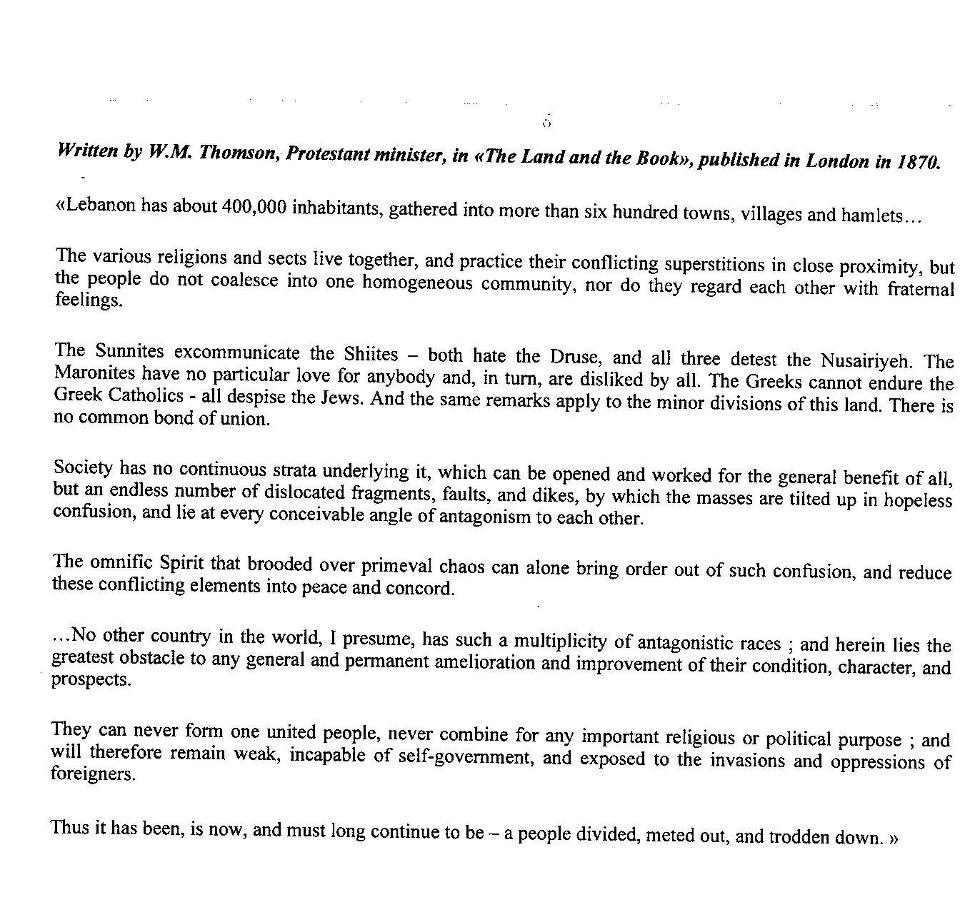 “The real problem with the Lebanese today is that they have gotten too good at this adapting game—so good that their cure and their disease have become one and the same. The Lebanese individual traditionally derived his social identity and psychological support from his primordial affiliations—family, neighborhood, or religious community, but rarely from the nation as a whole. He was always a Druse, a Maronite, or a Sunni before he was a Lebanese; and he was always a member of the Arslan or Jumblat Druse clans before he was a Druse, or a member of the Gemayel or Franjieh Maronite clans before he was a Maronite. The civil war and the Israeli invasion only reinforced this trend, dividing Lebanese into tighter-knit micro-families, or village and religious communities, but pulling them farther apart as a nation”