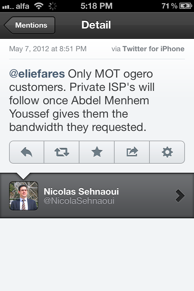 However, as I’ve asked Mr. Kreidieh on Twitter back when the “Unleash The Speed” campaign was underway in different areas of Beirut, the speed that your line got on that day is the speed you’d get under normal conditions once the new plans are implemented. I personally got 12Mbps back then and would be happy to get that much on a daily basis.