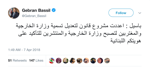 Gebran Bassil – our esteemed minister of Foreign Affairs and Immigrants – wants to change the name of the ministry he is heading from that dealing with Immigrant affairs, to – what I would assume translates as: Ministry of Foreign Affairs and the Diaspora. In Arabic, the change goes from Meghterbin to Mountashirin.