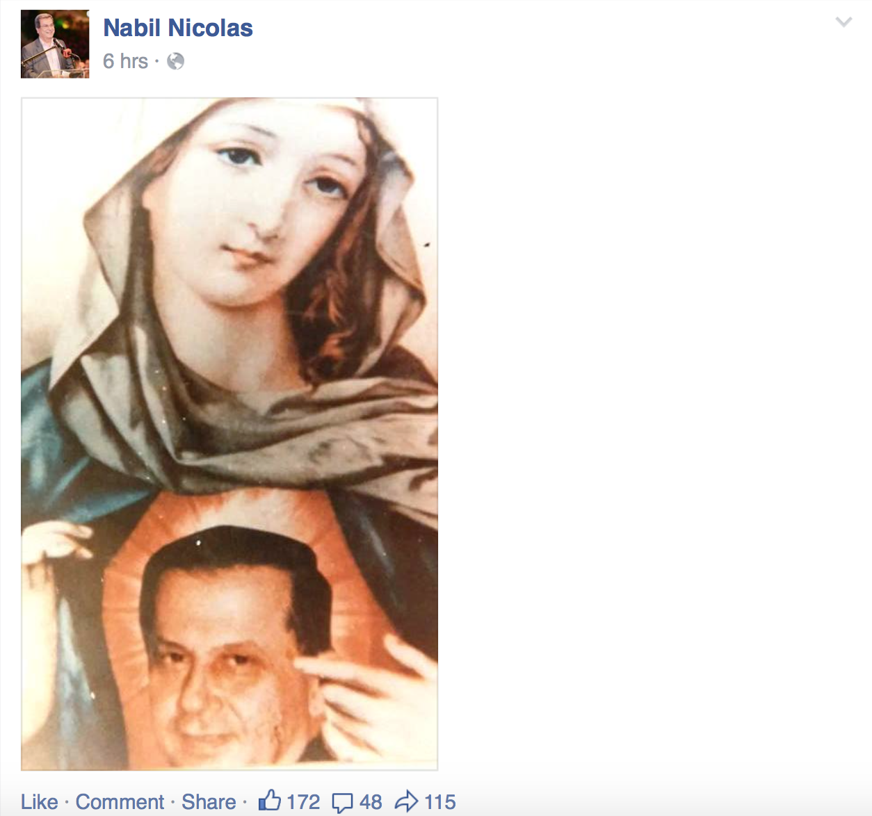 A few weeks ago, MP Nabil Nicolas, who was the first to rush down to Martyrs’ Square a few weeks ago and support the #YouStink movement, posted a picture on his Facebook account of his leader, Aoun, in the heart of the Virgin Mary. No further comment needed: