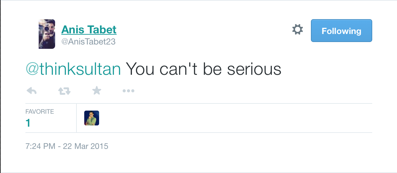 Of course, the tweet didn’t exactly pass under the radar. Anis Tabet of Let’s Talk About Movies was appalled and expressed his disgust at what he read, to which Sultan replied with the following brilliant notion: