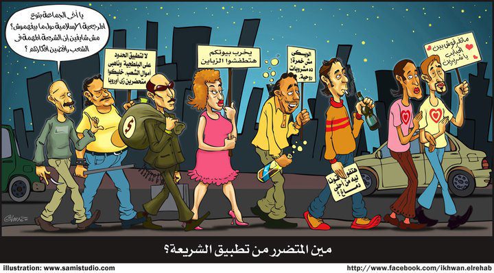 In order to showcase their point about the validity of their view of Islamic Sharia, this picture was made out to show people who would be damaged by applying the Sharia. You have, starting from right to left: the homosexuals, the alcoholics, the prostitutes, the corrupt politicians and killers: what they consider as the scumbags of society. The picture serves to paint a picture where these people would be eradicated from Egyptian society if the Muslim Brotherhood (and those with whom they have an alliance) win the elections.